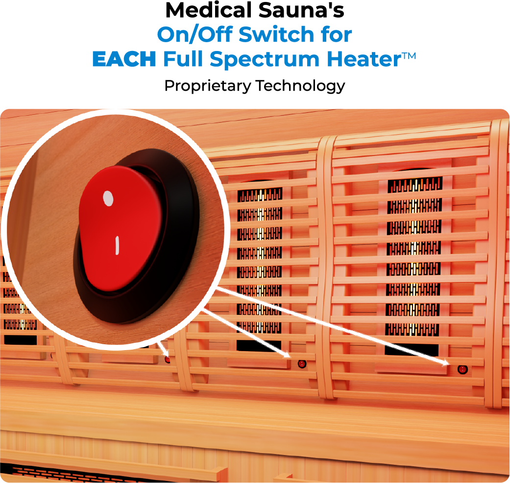 Unlike other companies that keep their heaters on constantly, we added an on/off switch to every full spectrum heater so you can turn them off individually when not in use. This not only conserves energy but also offers greater control over the sauna experience.